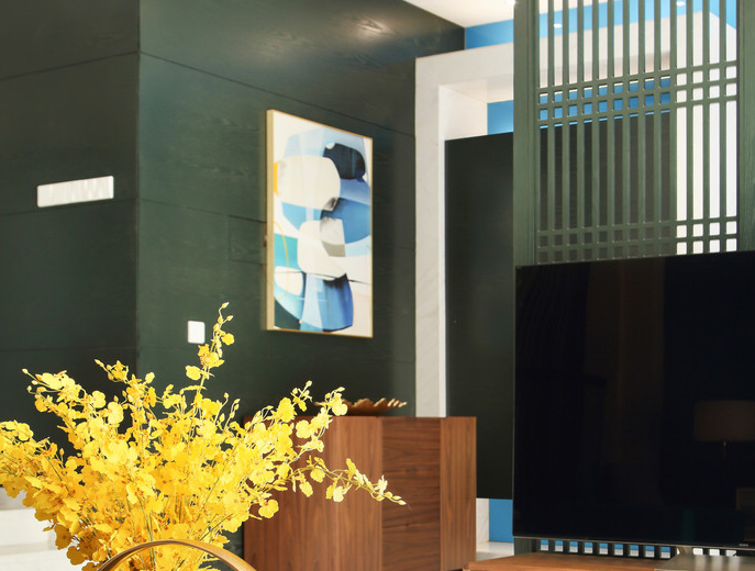 在入户空间,一进门就能感受到浓浓的现代感,墙柜的形式以及材质的搭配相得益彰,从入户--会客厅--餐厅--厨房的空间形成一个整体,入户和会客厅通过两扇中式隔断进行划分,既达到视觉上的区分,又不让空间显得闷重,会客厅到餐厅的过渡通过抬高地面形成高低差,让空间划分更加多元化。